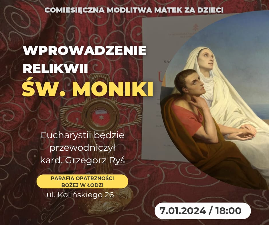 Obecność św. Moniki w jej relikwiach, bez wątpienia będzie ogromnym wsparciem rodziców naszej diecezji w modlitwie za swoje dzieci. Msza święta przez Jej wstawiennictwo w każdy 7 dzień miesiąca w parafii Opatrzności Bożej w Łodzi. Wszystkich serdecznie zapraszamy.