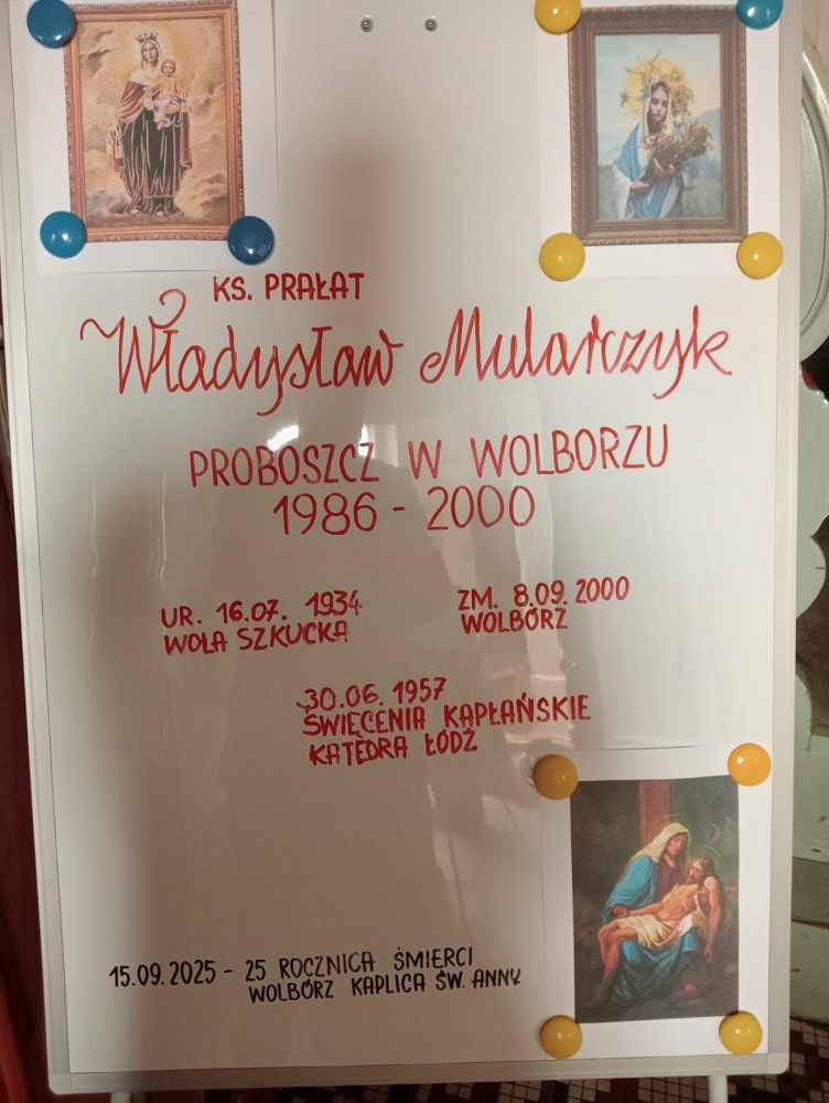 15 września 202515 września, Mszą Świętą sprawowaną w kościele św. Anny na naszym wolborskim cmentarzu, uczciliśmy pamięć jednego z Księży Proboszczów, naszej wspólnoty. Chodzi oczywiście o Księdza Prałata Władysława Mularczyka. W bieżącym roku przypada bowiem 25 rocznica jego śmierci. Z tej okazji polecaliśmy tego, cenionego przez parafian, duszpasterza, Bożemu Miłosierdziu, ale by niektórym przypomnieć, a niektórych nauczyć, kim był Ksiądz Proboszcz, nasz ks. Mirosław, przygotował wystawę upamiętniającą ks. Władysława. Wystawa obecnie jest dostępna w Kolegiacie. Zapraszany do odwiedzenia. Za wspólną modlitwę dziękujemy Wam obecnym na wspólnej modlitwie ale i ks. Dariuszowi Mordaka, który jako ówczesny współpracownik Księdza Prałata, przewodniczył naszej modlitwie.