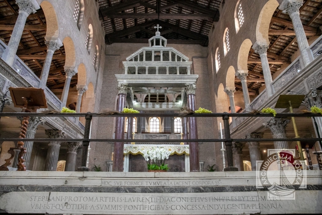 Jak tłumaczył abp G. Ryś w bazylice św. Wawrzyńca – za konfesją wzniesioną nad grobem świętego Diakona znajduje się taka – dość przejmująca płyta marmurowa, na której ułożona była krata – rodzaj grilla – gdyż Wawrzyńca męczono paląc go na kracie. Krata jest w innym rzymskim kościele, ale na tę płytę spływał pot i krew z Wawrzyńca. To jedna z najbardziej przejmujących relikwii jakie znajdują się w Rzymie. Płyta jest świadkiem męczeństwa św. Wawrzyńca. – zauważył hierarcha.