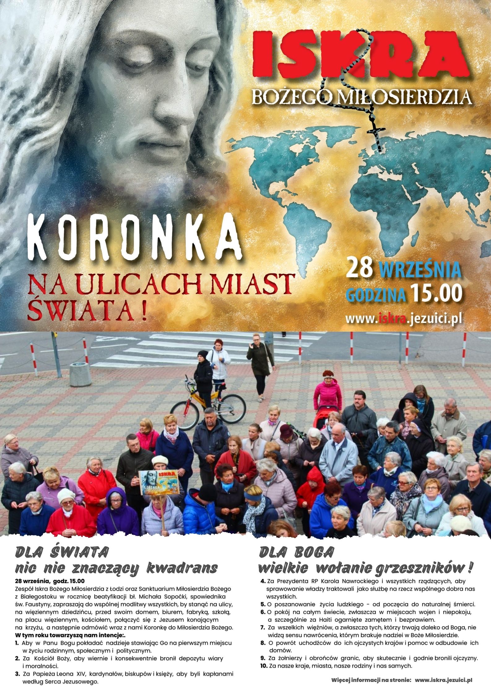 Zespół Iskra Bożego Miłosierdzia z Łodzi oraz Sanktuarium Miłosierdzia Bożego z Białegostoku w rocznicę beatyfikacji bł. Michała Sopoćki, spowiednika św. Faustyny, zapraszają do wspólnej modlitwy wszystkich, by o tej samej godzinie, tego samego dnia, stanąć na ulicy, na więziennym dziedzińcu, przed swoim domem, biurem, fabryką, szkołą, kościołem i połączyć się z Jezusem konającym na krzyżu, a następnie odmówić wraz z nami Koronkę do Bożego Miłosierdzia.