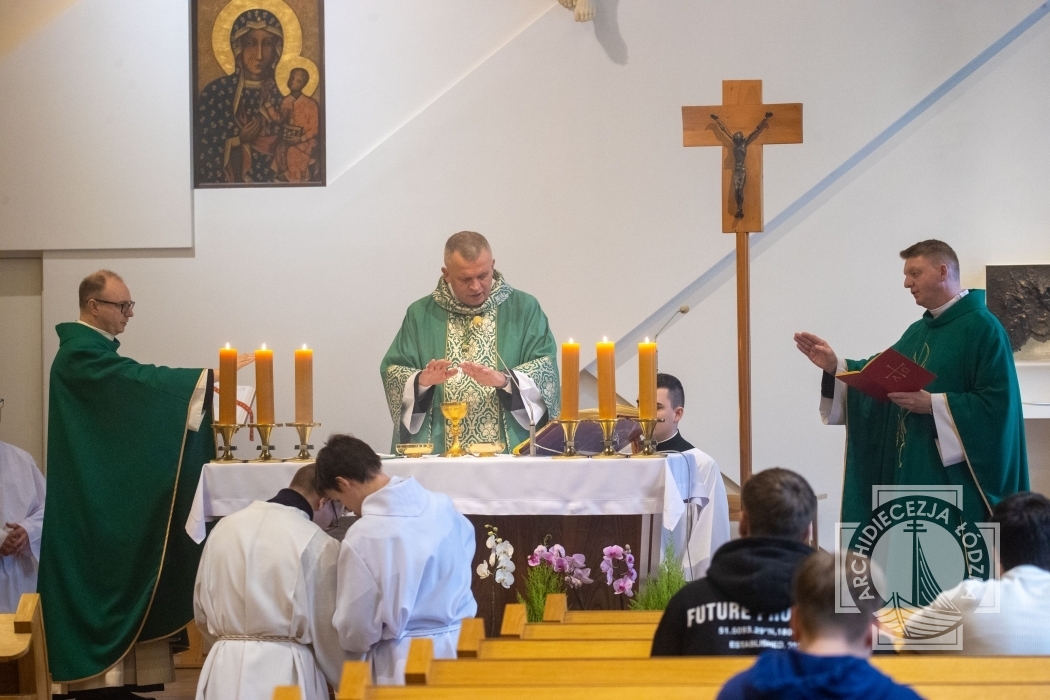 W niedzielne południe - w ostatnim dniu rekolekcji - Mszy Świętej w seminaryjnej kaplicy Dobrego Pasterza przewodniczył bp Zbigniew Wołkowicz, który odwołując się do liturgii Słowa Bożego zwrócił się do młodych mówiąc - myślę, że wielu z was zastanawia się, czego Pan Bóg chce od was w waszym życiu. Jak to życie przeżyć, żeby ono było szczęśliwe? W jaki sposób, do czego Pan Bóg mnie wzywa? Jaką drogą chce mnie poprowadzić? Tak naprawdę, najlepszym sposobem, żeby usłyszeć to światło, trzymać to światło, którym jest Pan Bóg, jest konkretna miłość. Myślę, że warto to sobie wziąć na poważnie do swojego serca. Chcę, żeby Pan Bóg mógł bez ograniczeń pokazać mi, gdzie będę szczęśliwy. Potrzebuje ode mnie tego, żebym ja stawał się darem dla każdego człowieka. Dlaczego tak jest? Bo Pan Bóg jest miłością. Jeżeli w moim sercu jest miłość, jeżeli żyję darem dla drugiego, więc w moim sercu jest miejsce dla Pana Boga, który może przyjść i oświecić mój umysł, moje serce, moje pragnienia, przekazać to, czego On ode mnie pragnie i wskazać drogę, na której będę szczęśliwy. Więc tak naprawdę te dwie rzeczy idą w parze. Z jednej strony ta bliskość Pana Boga, ale ta bliskość Pana Boga, która musi się wyrażać w konkretnej miłości albo w konkretnej bliskości do drugiego człowieka. Wtedy to światło, które jest we mnie, ono zabłyśnie, rozświetli ciemności, rozświetli moje wątpliwości, wskaże mi drogę, którą Pan Bóg chce, bym poszedł. - podkreślił administrator Archidiecezji Łódzkiej.