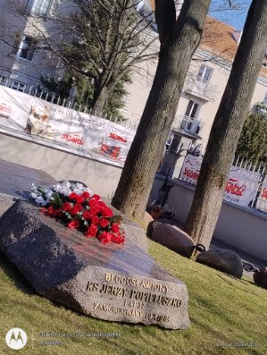 W dalszej części naszej pielgrzymki udaliśmy się do Parafii św. Stanisława Kostki, w której posługiwał bł. Jerzy Popiełuszko. Wielkim darem była dla nas obecność siostry Krystyny, którą ksiądz Marcin Pawłuszewicz zaprosił do pielgrzymowania z nami, a która w czasach księdza Jerzego posługiwała na plebanii. Siostra przybliżyła nam postać błogosławionego, opowiadając o tamtych czasach tak, jakby to było dzisiaj. Oprowadziła nas również po muzeum i kościele, pokazując między innymi konfesjonał, w którym spowiadał ksiądz Jerzy. Pytaniom pielgrzymów o wydarzenia z życia błogosławionego nie było końca. Siostra Krystyna zaprowadziła nas również do zamkniętej kaplicy, w której mogliśmy na własne oczy zobaczyć sutannę i koszulę, w której był zamordowany.