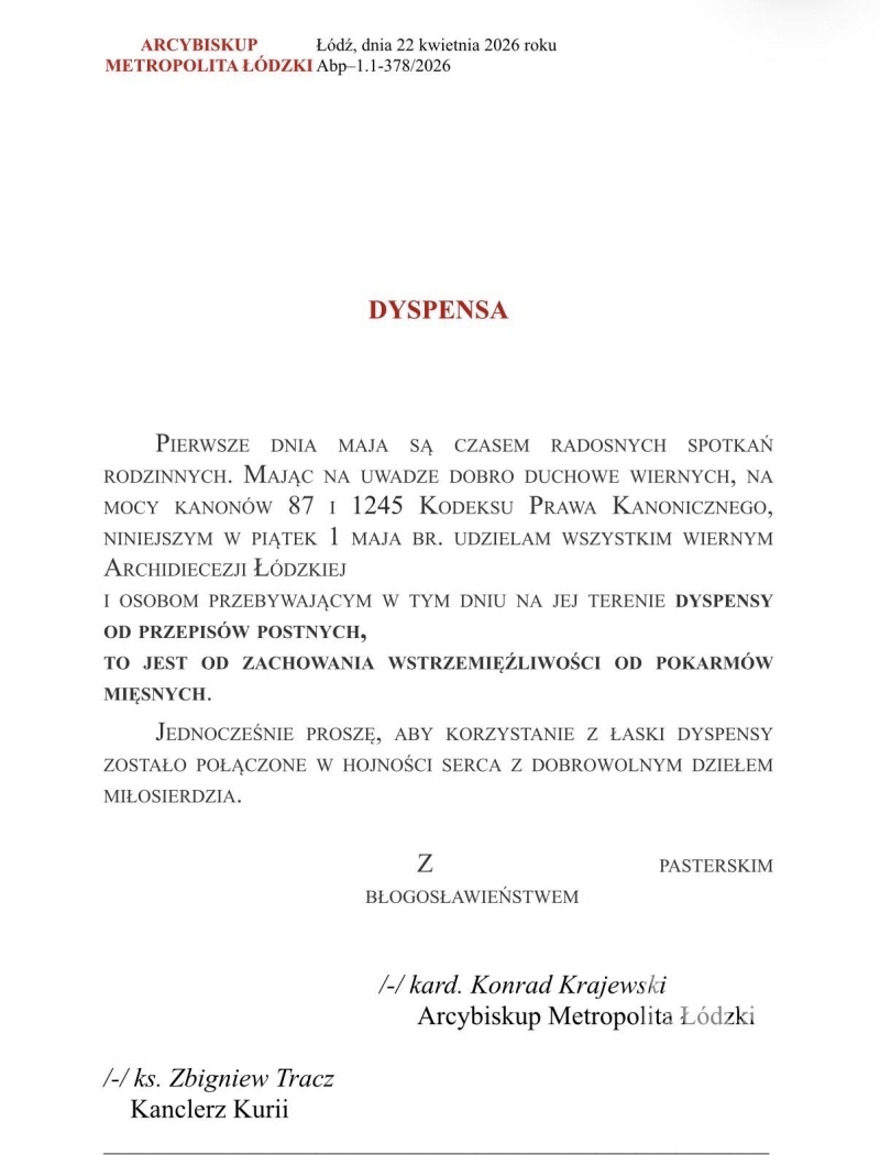Ksiądz Kardynał Konrad Krajewski udziela dyspensy od spożywania pokarmów mięsnych osobom wierzącym przebywający na terenie Archidiecezji Łódzkiej w piątek 1 maja, prosząc o akt miłosierdzia wobec potrzebujących.