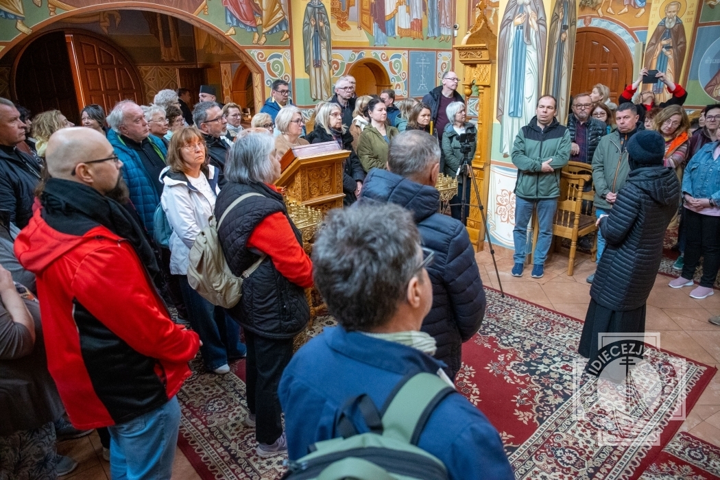 Następnie słuchacze Ekumenicznej Szkoły Biblijnej udali się do Cerkwi pw. Aleksandra Newskiego, która znajduje się w sąsiedztwie Sanktuarium w Sokółce i zapoznali się z historią świątyni oraz niewielkie wspólnoty prawosławnej w tym mieście, którą zaprezentował ks. mitrat mgr Włodzimierz Misiejuk– proboszcz posługujący od 40 lat w tejże parafii.
