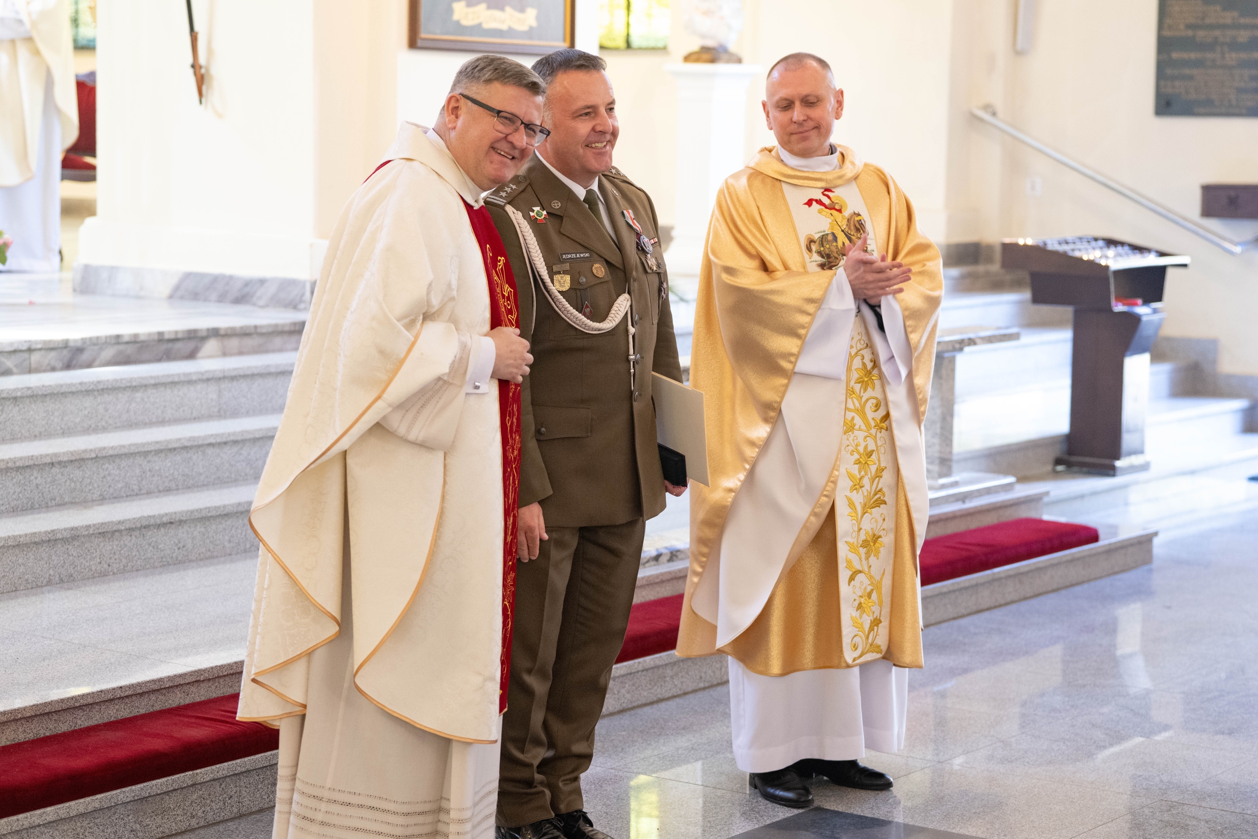Na zakończenie Mszy św. przedstawiciele parafii wręczyli ks. płk. Wikariuszowi Generalnemu pamiątkę. - Tak jak wybrzmiało to w wygłoszonej dziś homilii odpustowej św. Jerzy, który w ikonografii zwycięża smoka, uczy nas walki ze złem i własnymi słabościami. Dziękujemy za te słowa i modlitwę za żołnierzy pełniących służbę w łódzkim garnizonie, za ich rodziny oraz za całą naszą wojskową wspólnotę. Ufam, że ten czas modlitwy za wstawiennictwem św. Jerzego umocnił w nas ducha patriotyzmu i chrześcijańskiej odpowiedzialności za siebie nawzajem. Proszę od nas wszystkich, dziś tu zebranych, przyjąć szczególny dar, ikonę patrona naszej wojskowej parafii w Łodzi. Niech św. Jerzy uprasza Księdzu Pułkownikowi Boże błogosławieństwo, niech uprasza sił ducha, szacunku i wdzięczności żołnierzy i funkcjonariuszy, aby mógł Ksiądz Pułkownik cieszyć się owocami naszej wspólnej posługi w Ordynariacie Polowym – mówił proboszcz ks. ppłk. Tomasz Krawczyk.